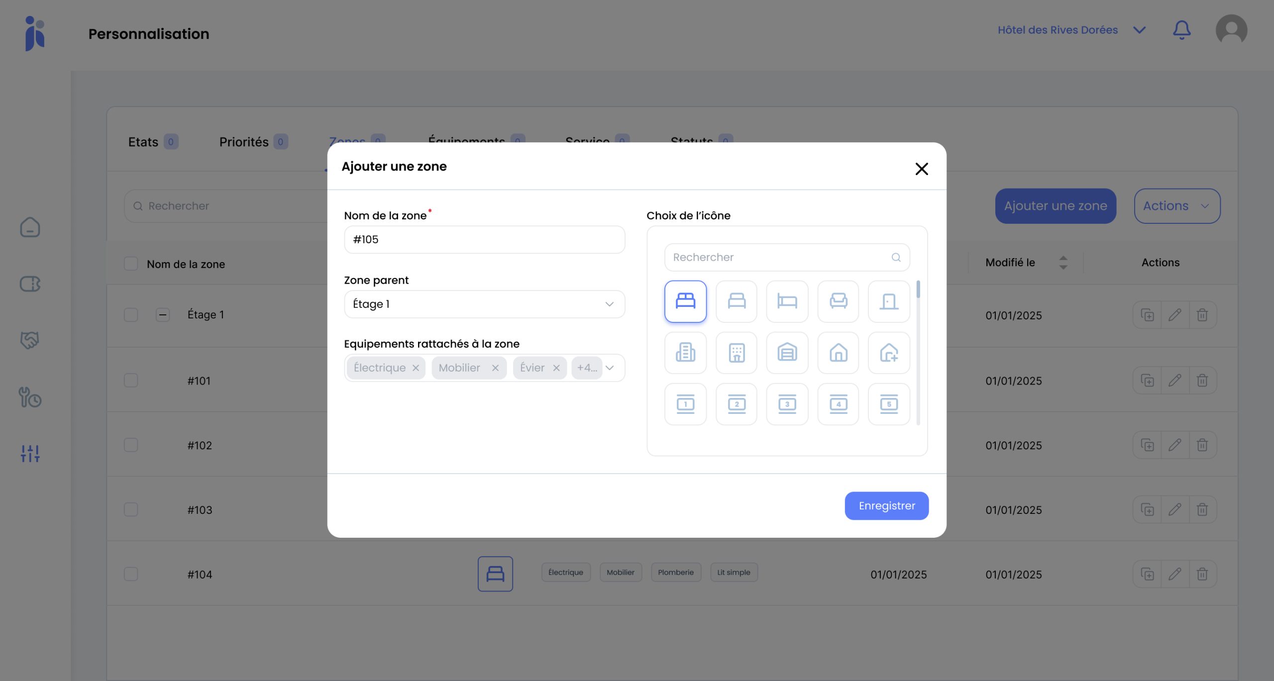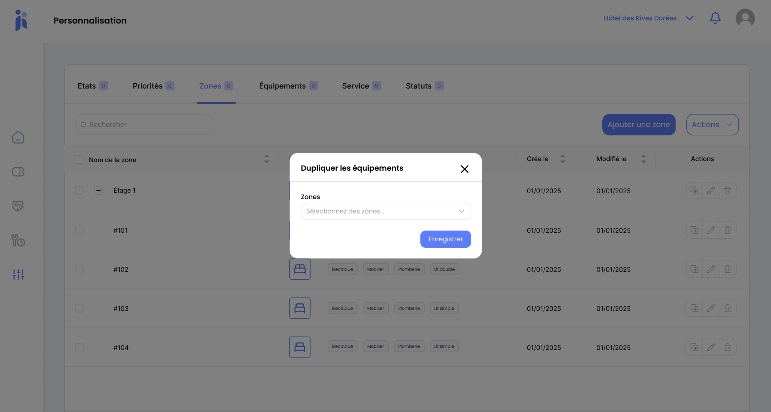 2. Sélectionnez les zones ou vous souhaitez dupliquer les équipements. Puis cliquez sur « Enregistrer ».